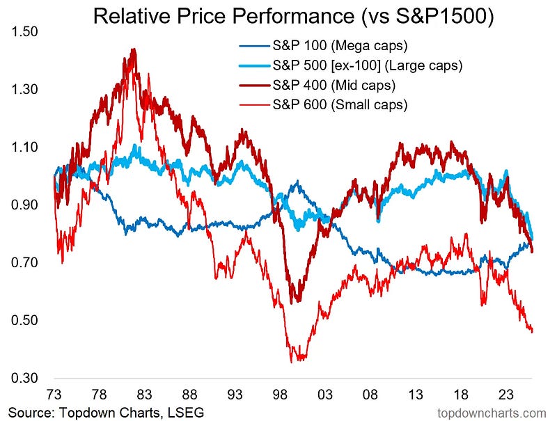 Basically everything that's not mega caps have underperformed --- even large caps have seen significant underperformance (i.e. the S&P500 excluding the top 100 stocks)