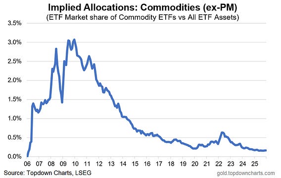 Here’s a chart of implied investor allocations (i.e. ETF market share) for Commodities ex-gold [includes broad/diversified commodity ETFs + individual commodity ETFs such as oil, natural gas, copper, agri commodities]