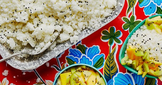 It’s starting to get hot and this is the thing I make when I need something cold and light. Horchata granita. Super simple, you freeze it, scrape it, and eat it. It’s creamy and finished with mango, kiwi, and pineapple.