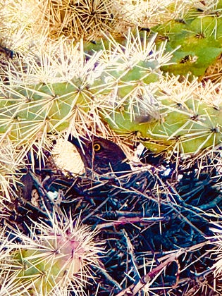 She built her nest deep inside a cholla cactus. Safe and defended… though still eyeing me, on the lookout for trouble.