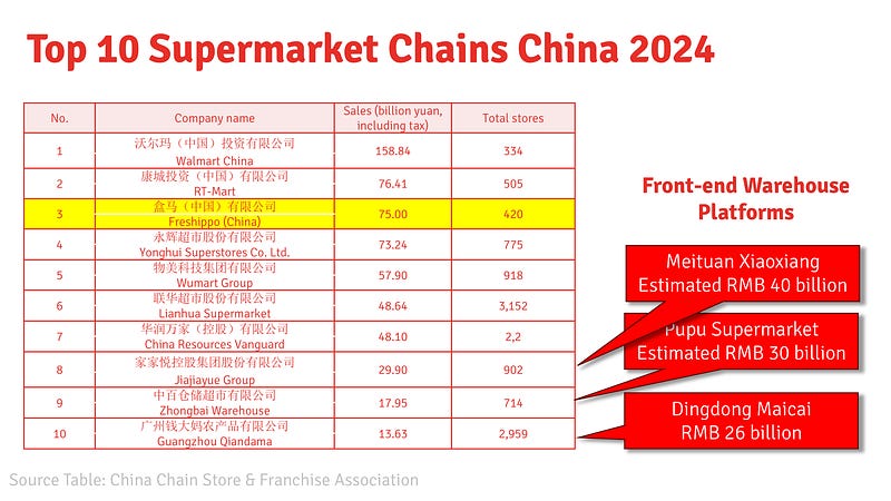Last year, during a masterclass I gave during a ChinaTechTrip study tour, I showed how front-end warehouses like Meituan Xiaoxiang and Dingdong Maicai had already become larger than some traditional supermarkets in China (see table below).