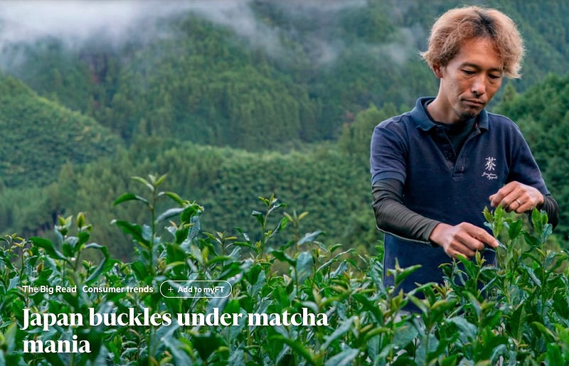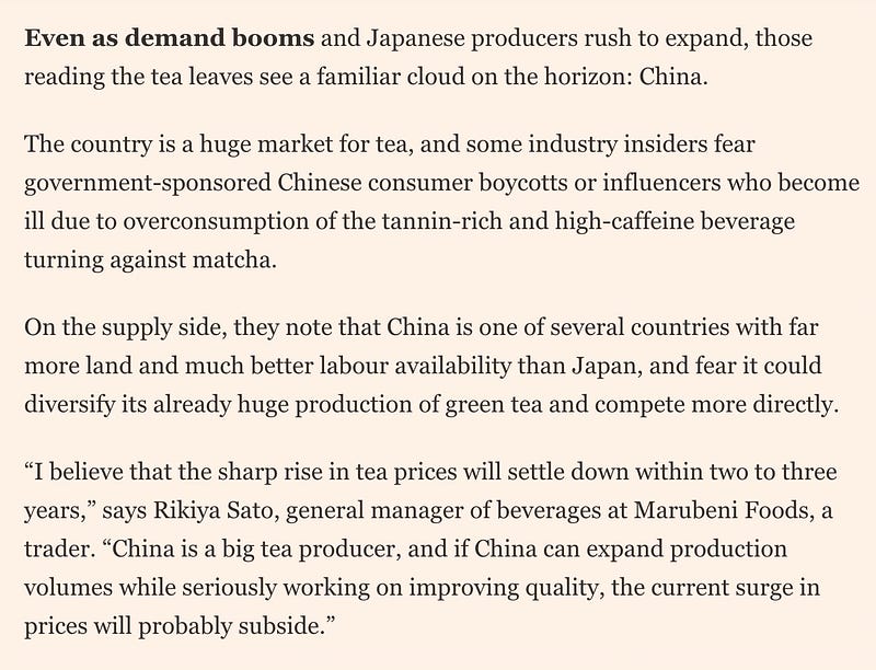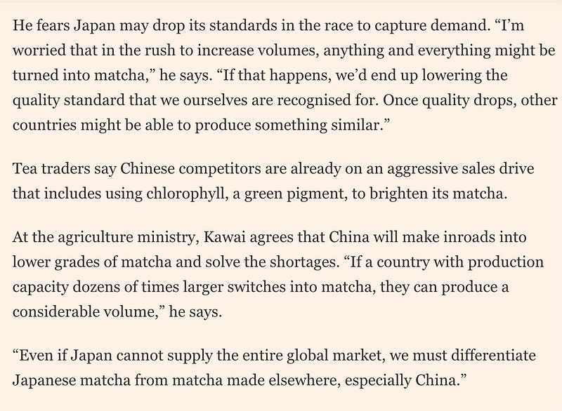 It’s not hard for the FT to ask the China team to get comments and relevant data. I, for one, would love to read about how Chinese professionals respond to the comments made about them. Moreover, I'd love to see how ready they are in responding to the global matcha shortage, but that information is lacking.
