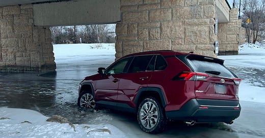 Never ever drive in a channel let alone one with a bridge over it, that’s just common sense, it appears too many people didn’t get in line to get there’s when God was passing it out.