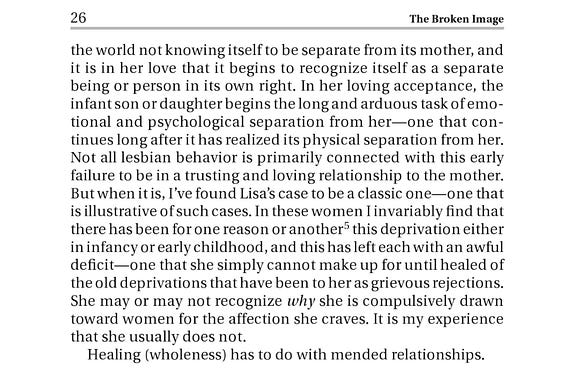 Payne, like many ex-gay advocates, presents views of homosexuality that are distinctly Freudian. She presents a narrative of female homosexuality where the infant is attached to the mother, and then must go through a process of “emotional and physical separation.” When the attachment was not originally able to occur, the child seeks out attachments from others, in ways that could result in lesbianism.