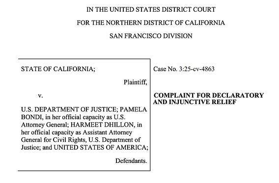 BREAKING: California sues the Trump administration over the Justice Department’s claim that allowing trans girls to participate in girls sports is unconstitutional.