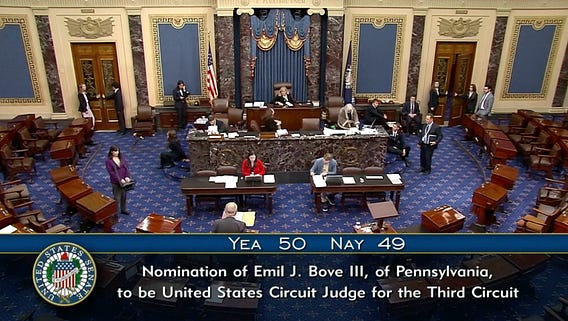 BREAKING: The Senate Republicans, on a 50-49 vote, just confirmed Emil Bove to be a federal judge on the U.S. Third Circuit Court of Appeals.