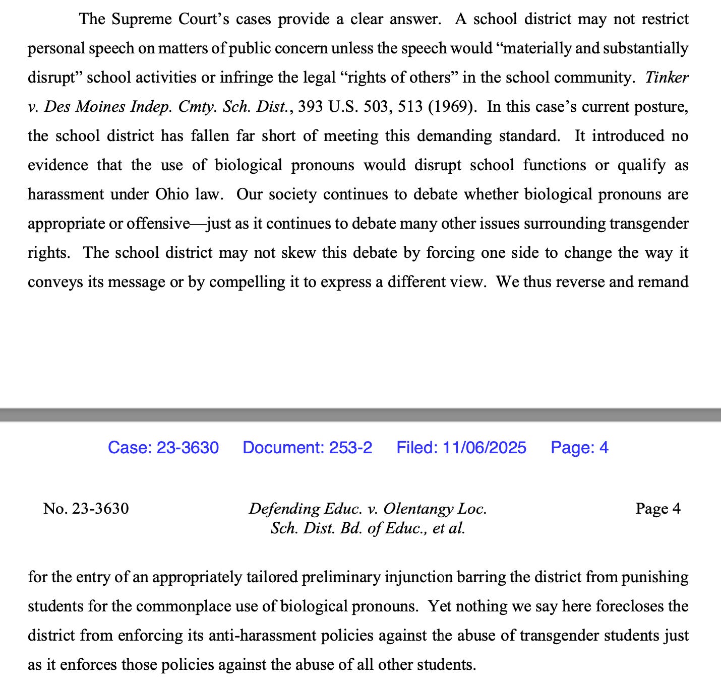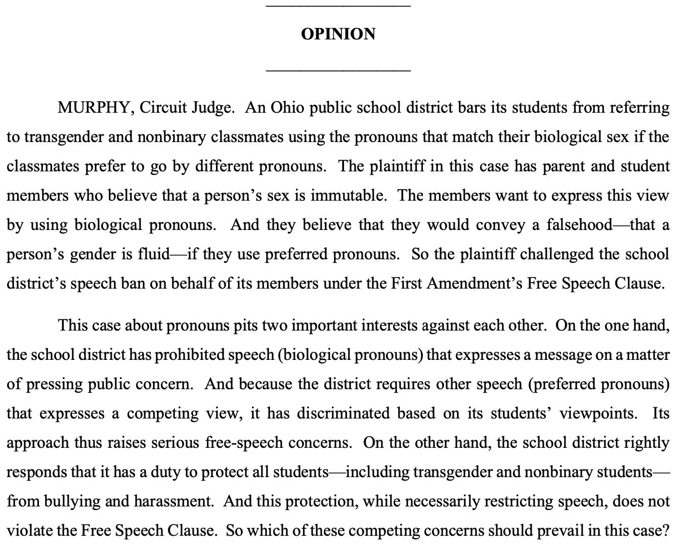 BREAKING: A federal appeals court on Thursday issued a decision referring to “biological pronouns” and holding that an Ohio school district's policy barring students from misgendering transgender students — by using such “biological pronouns” — likely violates the First Amendment.