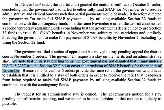 BREAKING: The U.S. Court of Appeals for the First Circuit denied the Justice Department's request for an administrative stay of the temporary restraining order requiring full SNAP benefits be paid by Friday.