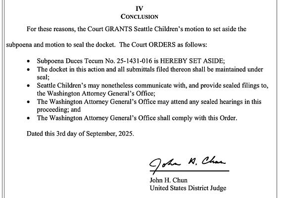 BREAKING: Seattle Children's Hospital successfully fought this summer to get the Justice Department’s invasive trans care subpoena quashed.