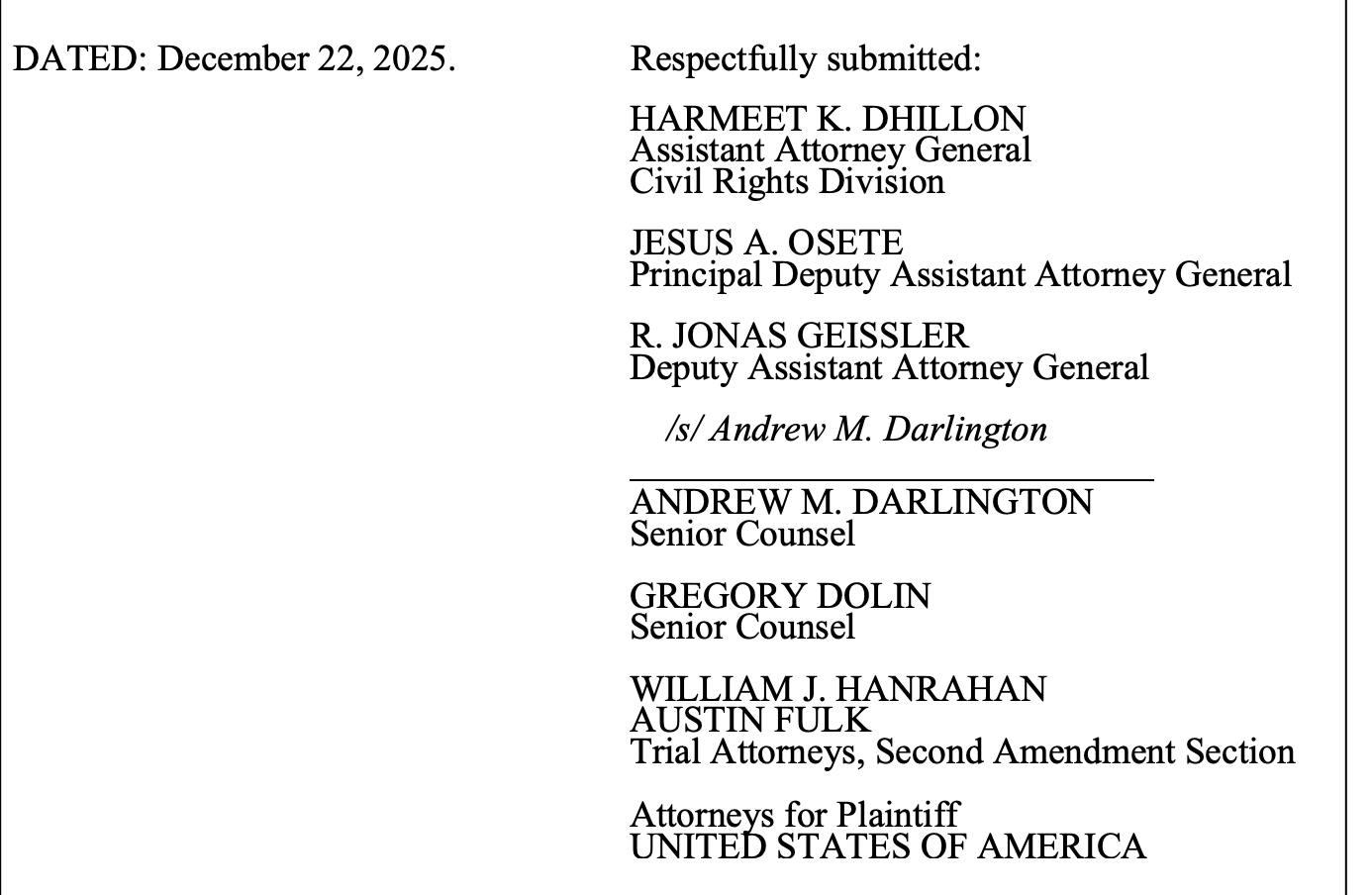 The complaint was submitted by several attorneys, led off by Dhillon and signed by Andrew Darlington, who previously was the director of the "Florida Office of Election Crimes and Security" and is listed on DOJ’s web site as the “acting chief” of the “Second Amendment Section” of the Civil Rights Division.
