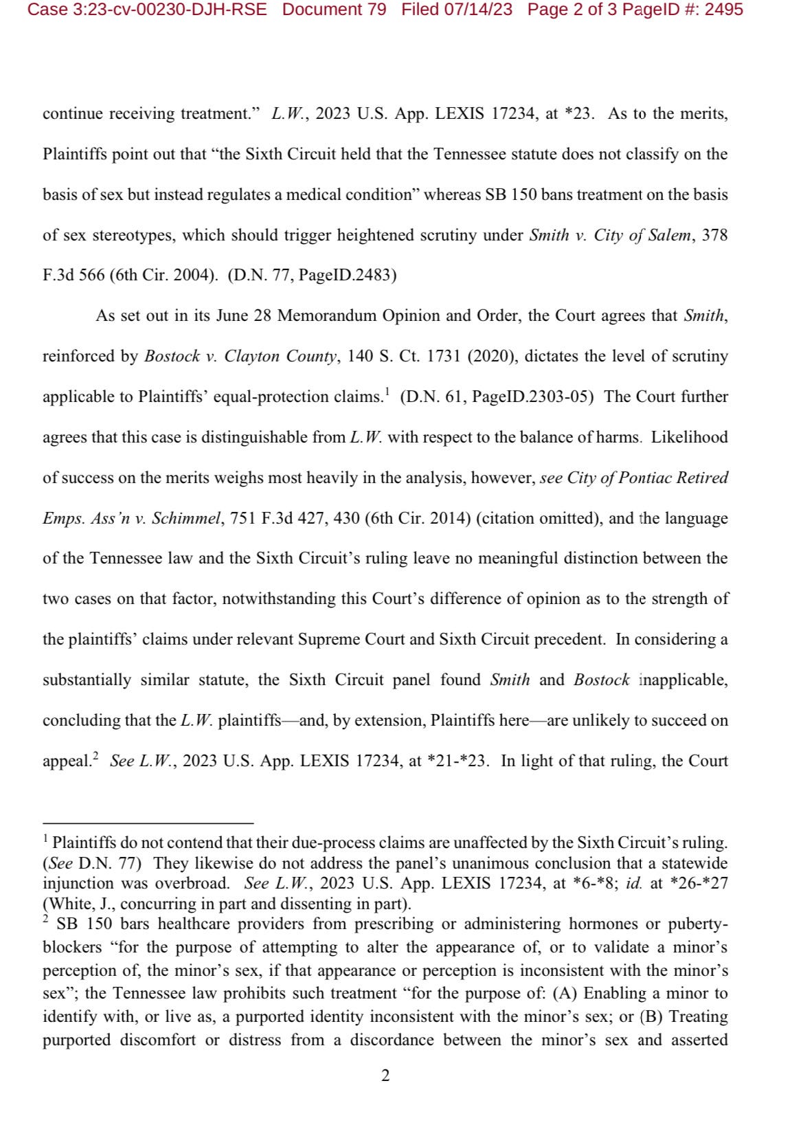 The 2-1 decision from the Sixth Circuit on July 8 granting Tennessee’s request for a stay pending appeal in the challenge to that state’s ban is precedent for all district court judges within the circuit — which includes Kentucky, Ohio, and Michigan, in addition to Tennessee.