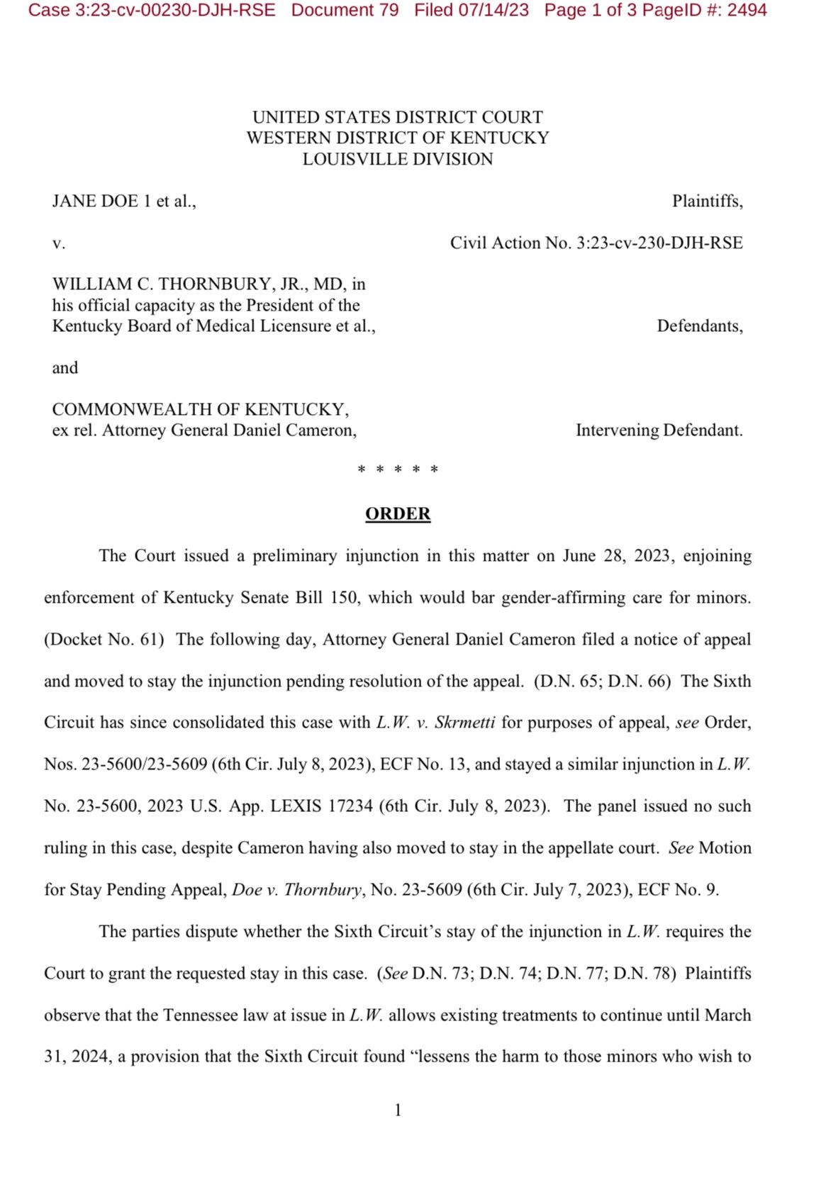 BREAKING: Kentucky ban on gender-affirming care for minors can be enforced during appeal, judge rules.