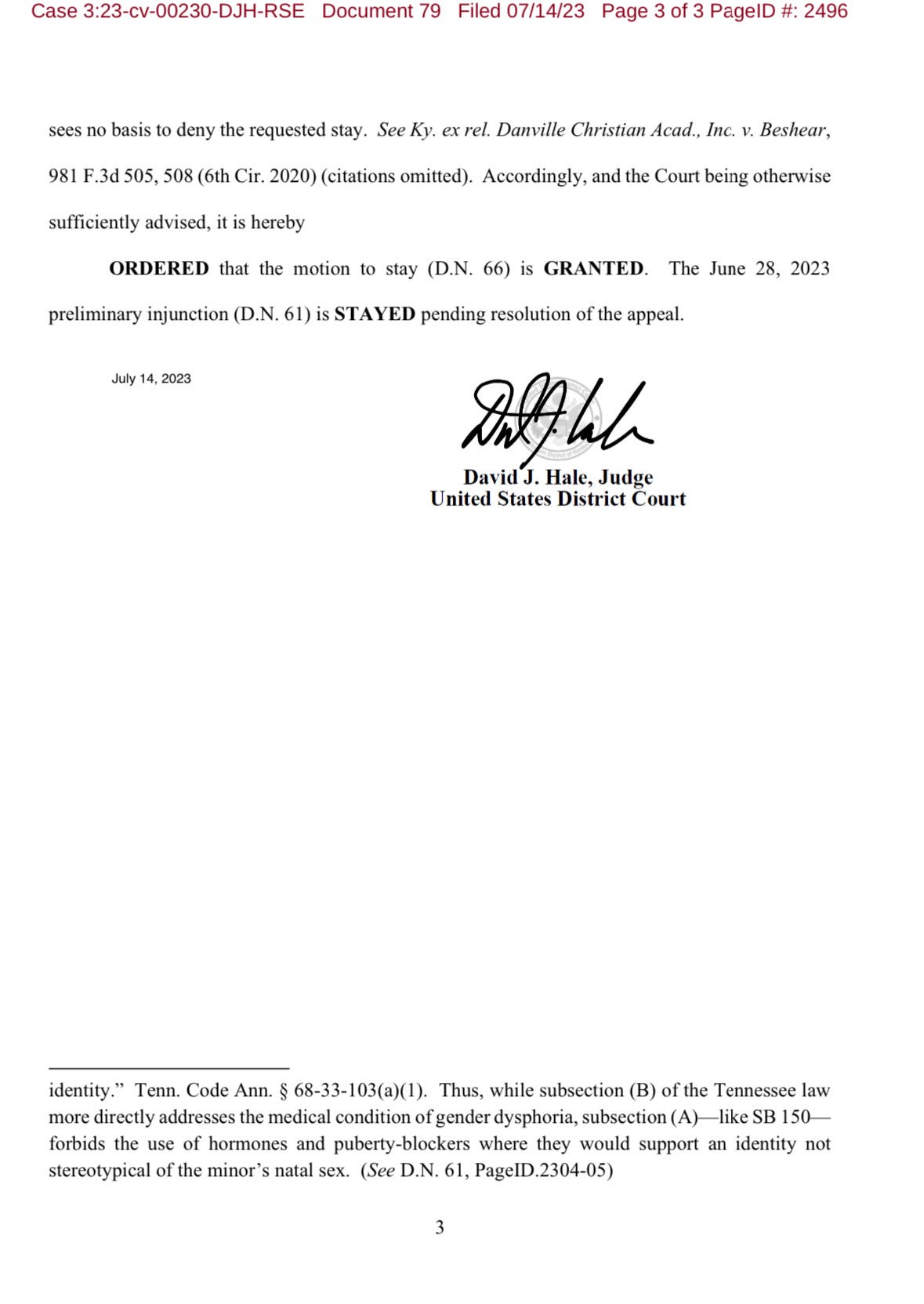 U.S. District Judge David Hale concluded that Tennessee and Kentucky’s bans are too similar for him to deny Kentucky Attorney General Daniel Cameron’s request to stay the injunction pending appeal, given the 2-1 decision from the Sixth Circuit granting Tennessee’s similar request for a stay pending appeal.