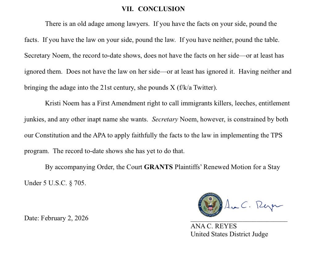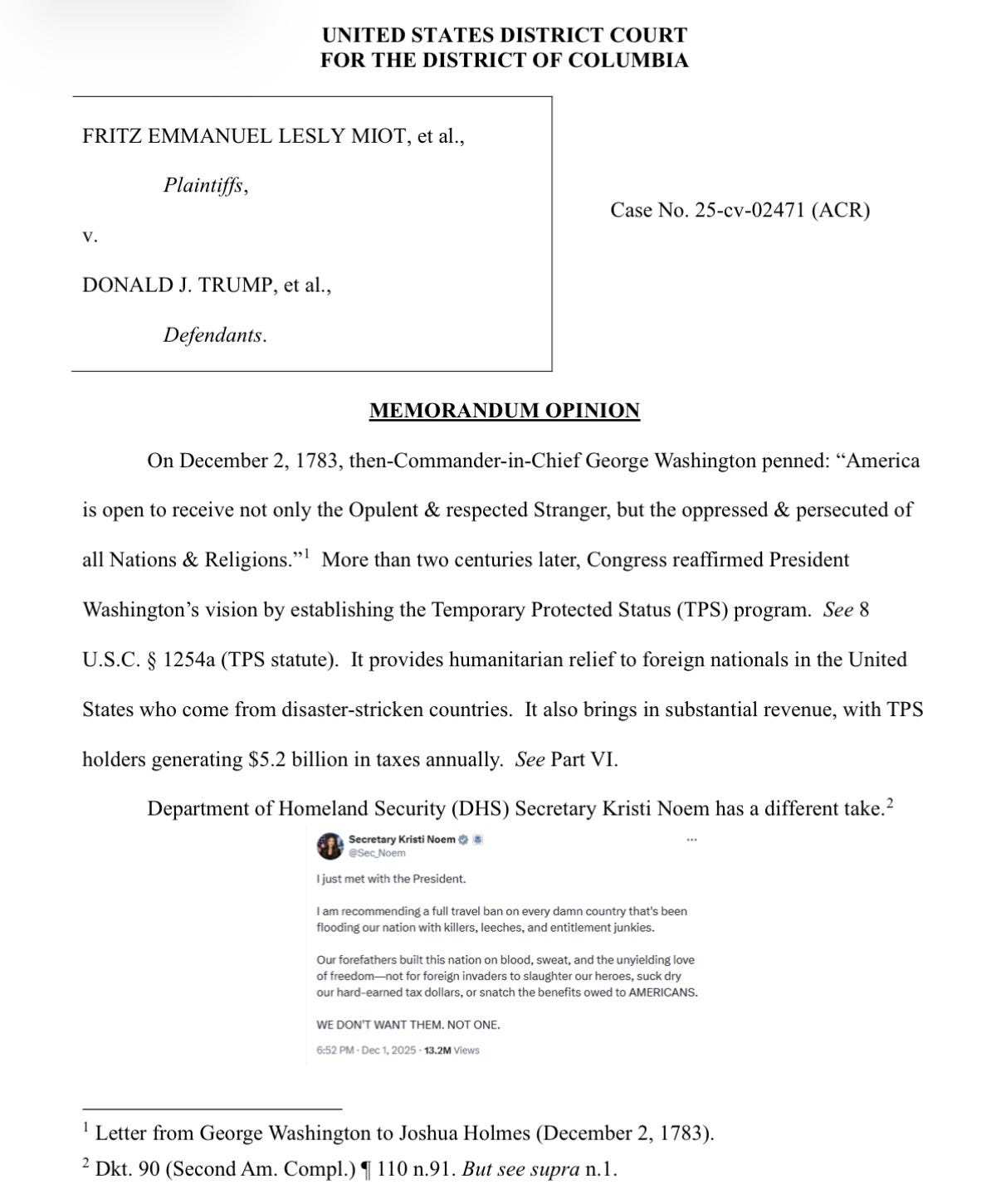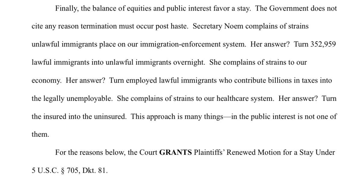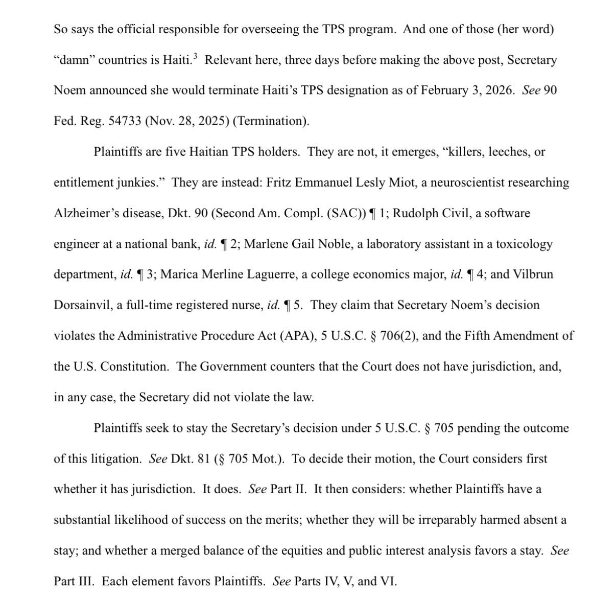 BREAKING: US. District Judge Ana Reyes, in D.C., issued a stay on Monday evening of Homeland Security Secretary Kristi Noem’s decision to end Haiti’s temporary protected status (TPS) designation, a decision that was to go into effect on Tuesday and could have ended legal status for up to 350,000 people overnight.