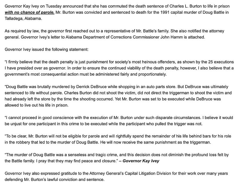 BREAKING: Alabama Gov. Kay Ivey announced on Tuesday that she was granting clemency to Sonny Burton, commuting his death sentence to a sentence of life in prison without the possibility of parole.