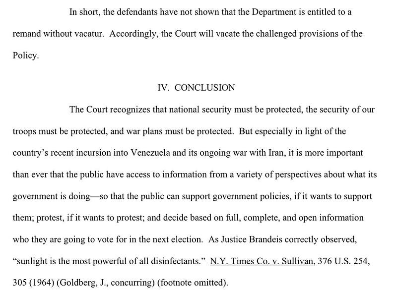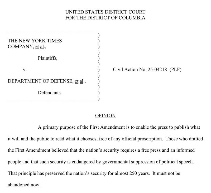 BREAKING: a federal judge on Friday tossed out provisions in the Pentagon’s new press policy — which most longtime reporters refuse to sign on to — as violations of the First and Fifth Amendments.