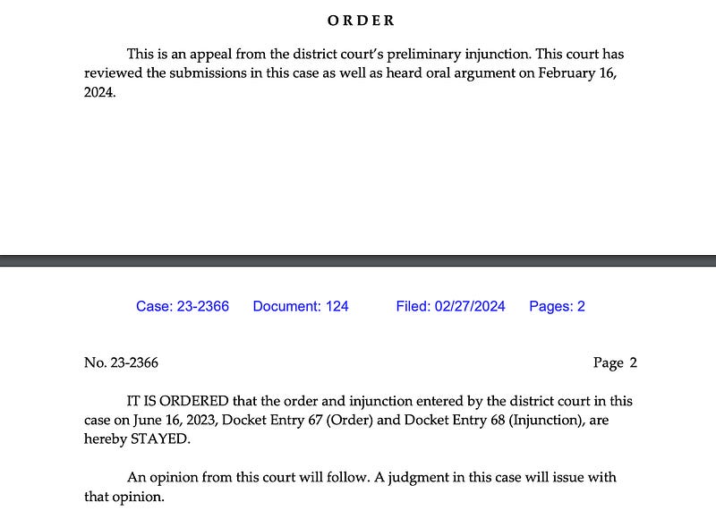 The three-judge panel’s order — technically an order to stay the district court’s injunction against the law’s enforcement — came in the wake of briefing and oral arguments earlier this month over the state’s appeal of the district court’s ruling.