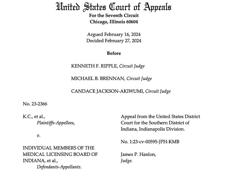 BREAKING: The U.S. Court of Appeals for the Seventh Circuit on Tuesday allowed Indiana’s ban on gender-affirming medical care for minors to go into effect as to the use of hormones or puberty blockers for transgender minors, as well as an unusual “aiding or abetting” provision, for the first time since the law’s passage in 2023.