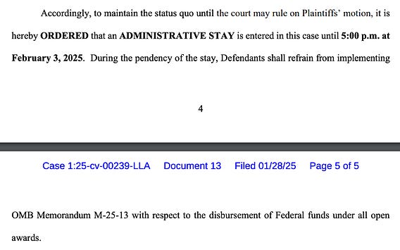 BREAKING: Hours after a lawsuit was filed on Tuesday, U.S. District Judge Loren AliKhan temporarily blocked the Trump administration’s effort to “pause” funding of current federal grants and loans.