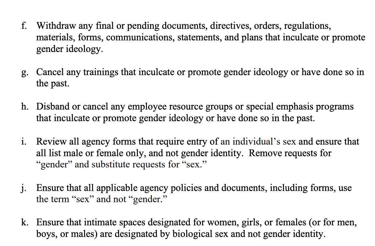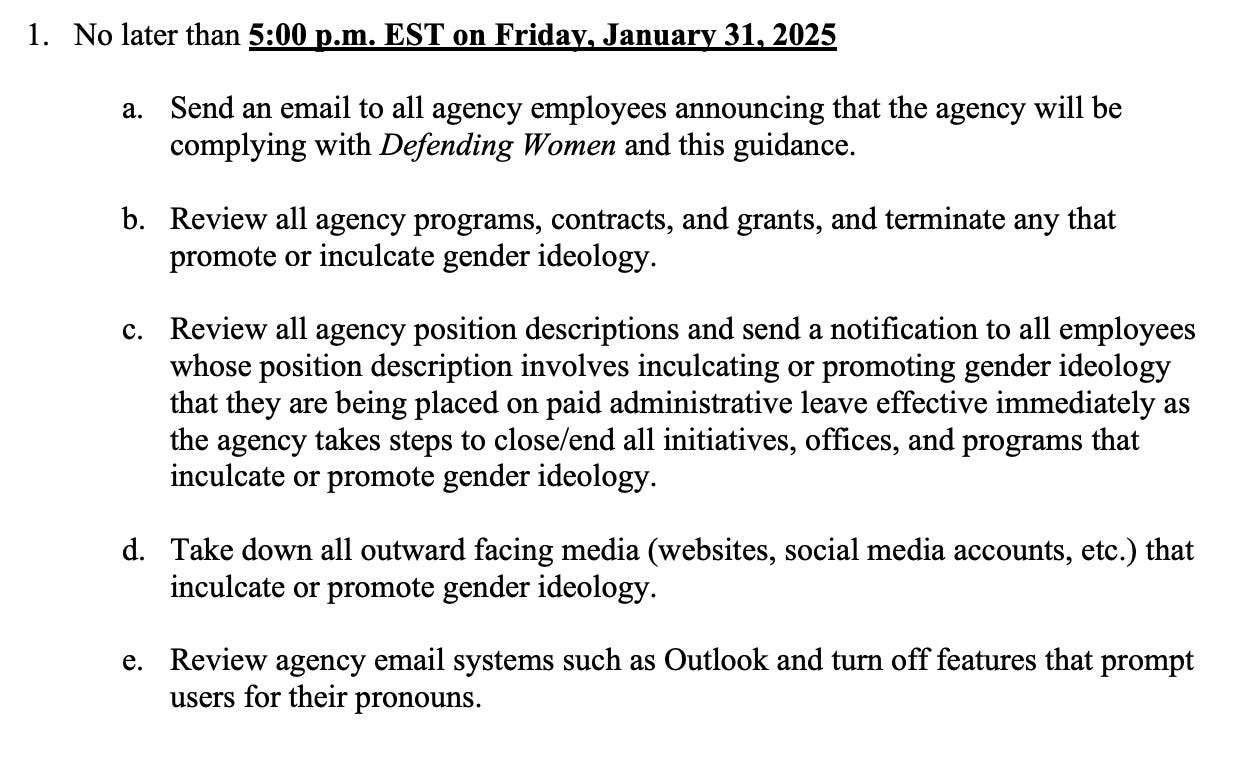 BREAKING: The Trump administration tells agency and department heads that they must implement an anti-trans bathroom ban and "terminate" any “programs, contracts, and grants” that "promote or inculcate gender ideology" by 5 p.m. Friday, among other steps.