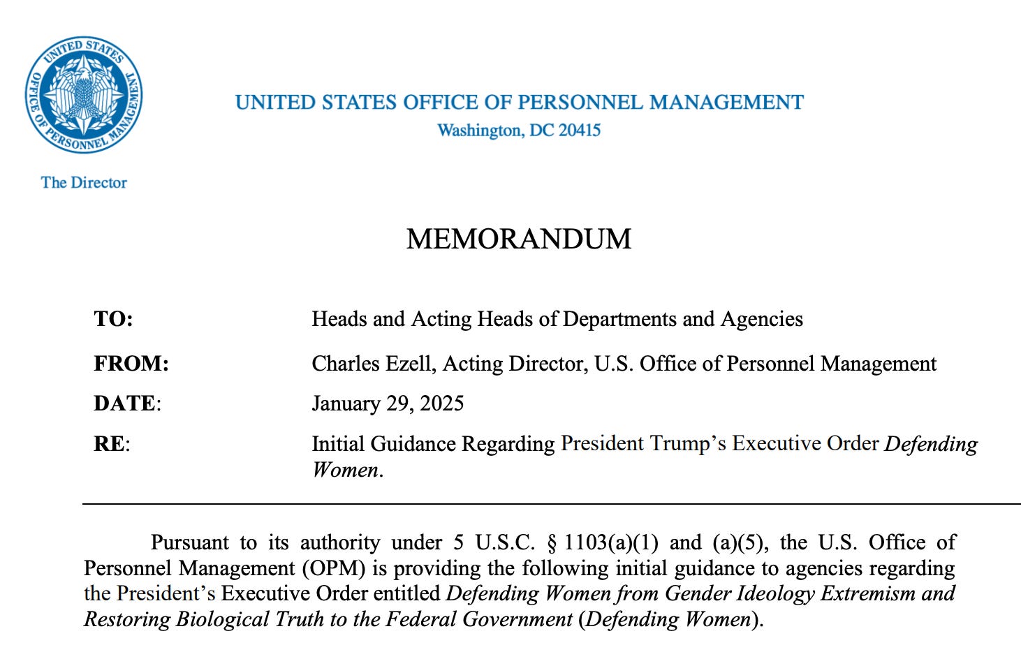 The “initial guidance” comes from Chuck Ezell, acting director of the Office of Personnel Management, and purports to implement President Donald Trump’s anti-transgender “sex” definition order signed on January 20, 2025.