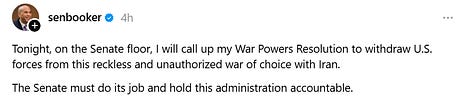 I will be on the floor with Cory to offer this resolution. There is a growing group of Democratic Senators who refuse to let Republicans keep the Senate silent on this incoherent, illegal, disastrous war.