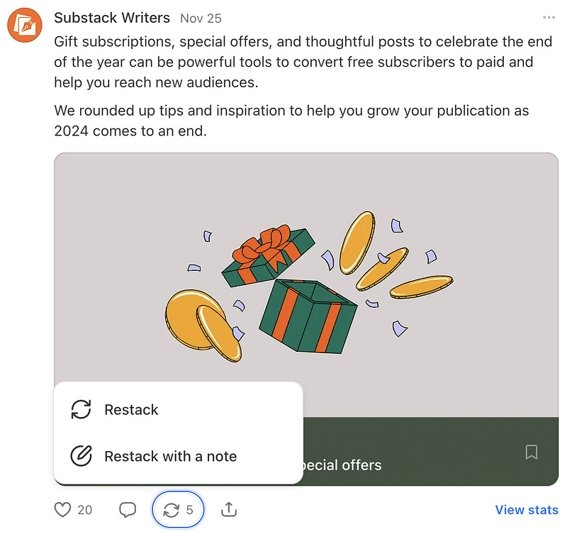 Para hacer un restack, simplemente haz clic en el ícono de flecha circular cuando veas una publicación, nota o comentario que quieras compartir. También puedes resaltar un fragmento específico de texto y seleccionar "Restack" para compartir solo esa parte. Los restacks aparecerán en el feed principal de tus suscriptores y seguidores, pero no se envían por correo electrónico.