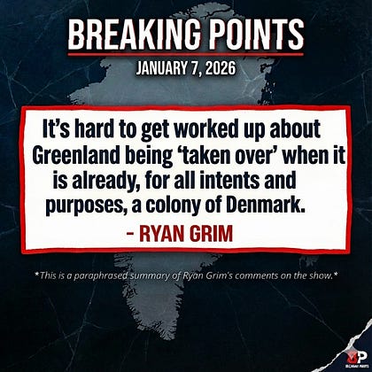 I am usually a fan of Ryan Grim and his reporting but his conversation with Saagar Enjeti on Breaking Points today was not his finest hour. While his country is drunk on war, genocide, regime change and the prospect of “taking Greenland'“, he suggested that it was hard to get worked up about Greenland because “it’s already a colony”. Greenland, perhaps to his surprise, is not a colony however, and is instead an autonomous constituent country with its own language and culture and a distinct identity that should be respected. Grim went on to calculate how much it would cost the United States to buy off each Greenlandic citizen as if a price can be placed on their identity and heritage in exchange for being owned by a country that is the greatest enemy of peace on earth and seeks to use them as a military base and a resource to be tapped dry. The relatively small population of Greenland should not devalue the rights of those people and they should not be treated like a piece of meat being bartered for at market. This is the same sick mentality that has the United States and their client state Israel causing untold suffering in Gaza. Americans often frame debates around whether a leader is or is not a dictator as a convenient justification for war and invasion, even as their own presidents readily cozy up to those same figures. They argue about whether owning Greenland would be good or bad for the United States, yet rarely question whether they have any right to set foot in someone else’s sovereign territory in the first place. It’s this mindset that continues to isolate the U.S. in the eyes of ordinary people around the world. A genuine discussion can be had about whether Greenland should maintain its current status or move toward full independence, but not about whether it should be handed over to the school yard bully and swallowed up as a pawn of empire. Ryan is usually one of the good ones, and I hope and expect that he can do better in the future.