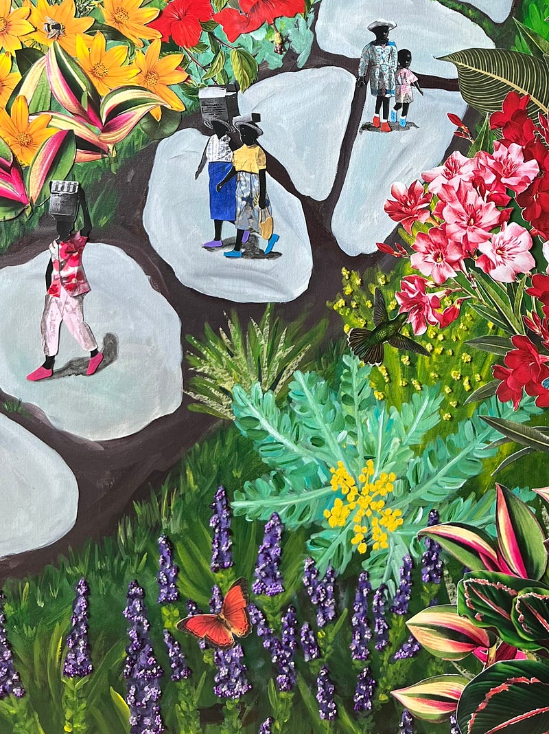 Paper, acrylic, and beads on canvas