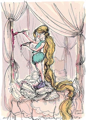 One of the first visual development pieces I did while working at Disney on Tangled. Little kid Rapunzel. This was a costume design assignment but I wanted to showcase her outfit options through actions that could show her irrepressible creative spirit. This is a first in a series I’ll be posting about my work at Disney.