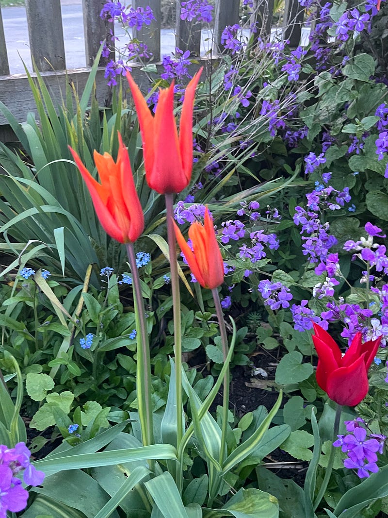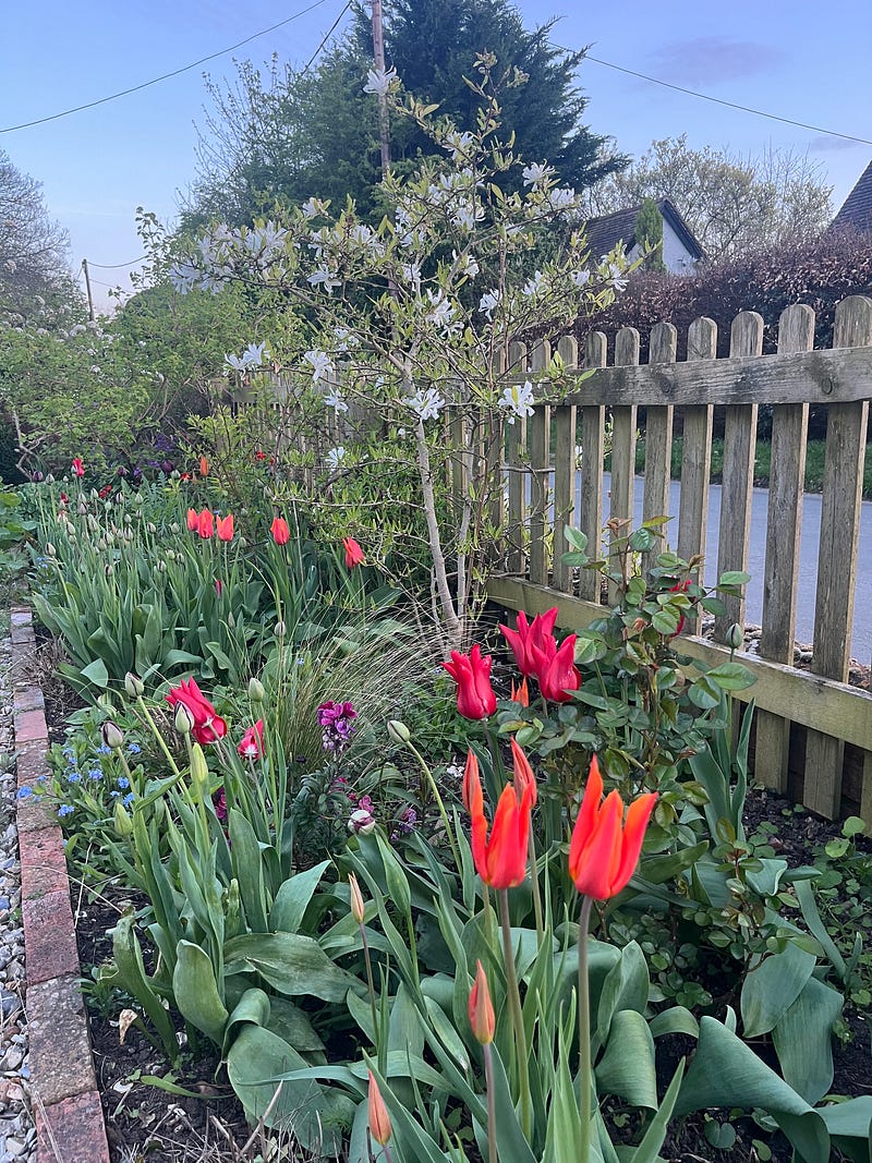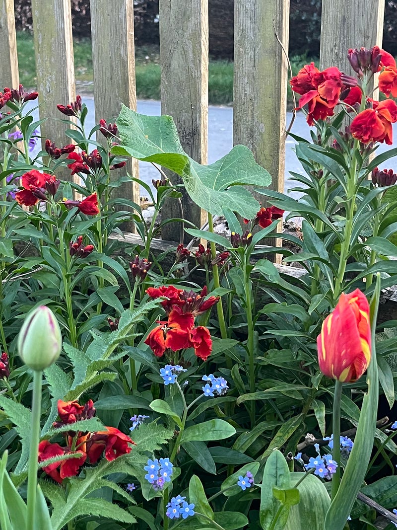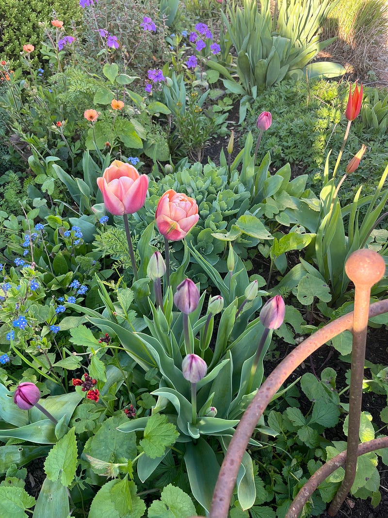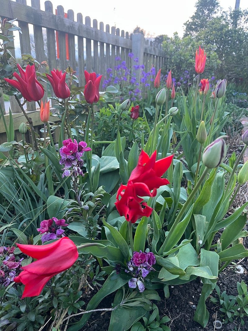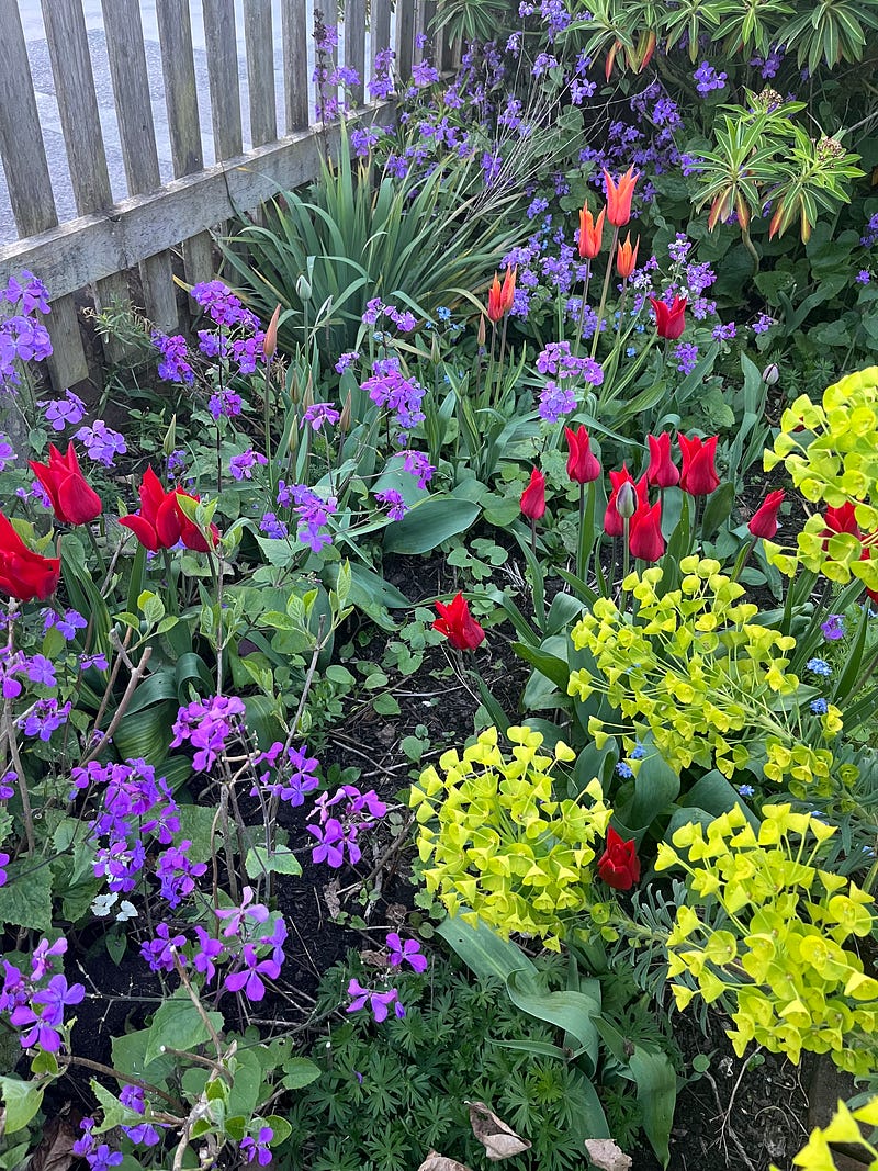 The crimson Pieter de Leur tulips are multiplying, I swear! Last year I thought the colour was too much - this year I can’t get enough of it, and I love the clash with orange Ballerina, purple honesty and lime green euphorbia. Spring has sprung.