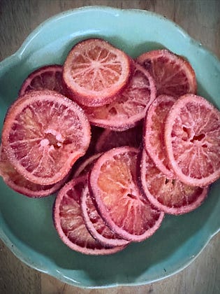 Obsessed with these chewy, fizzy orange slices. They’re the blood orange pieces left over from making cheong a few weeks back, dehydrated in a low oven for a couple of hours then tossed with a mixture of caster sugar and citric acid. They’re like fizzy gummy sweets but made of actual fruit and I can’t stop eating them…
