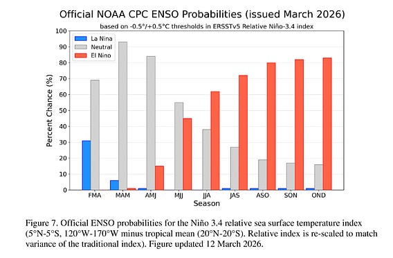 The March, 2026, ENSO probabilities forecast was just released by NOAA this morning, and whoa! This has taken a hard turn towards El Nino since the February forecast. Now 60%+ by mid-Summer!