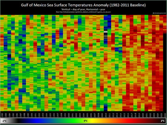 In case you missed the news, the Gulf of Mexico is currently at a record daily high sea surface temperature, about 1.80°C above the 1982-2011 baseline.