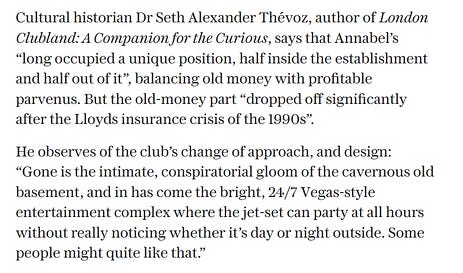 I recently spoke to the Daily Telegraph for their piece, “Annabel’s was once London’s most exclusive club, now it’s the ‘House of Naff’.“ Full article in the link below. telegraph.co.uk/news/20…
