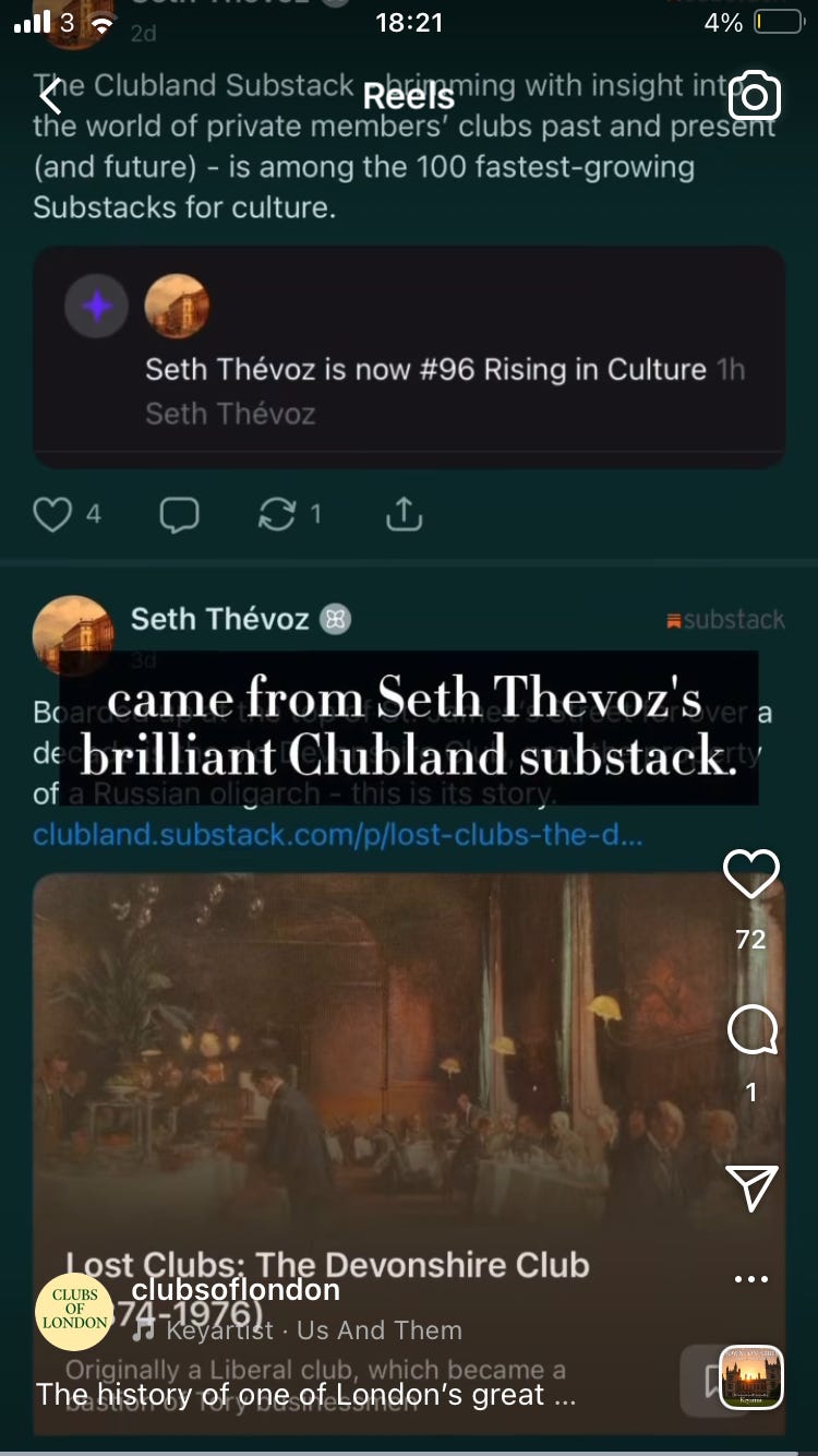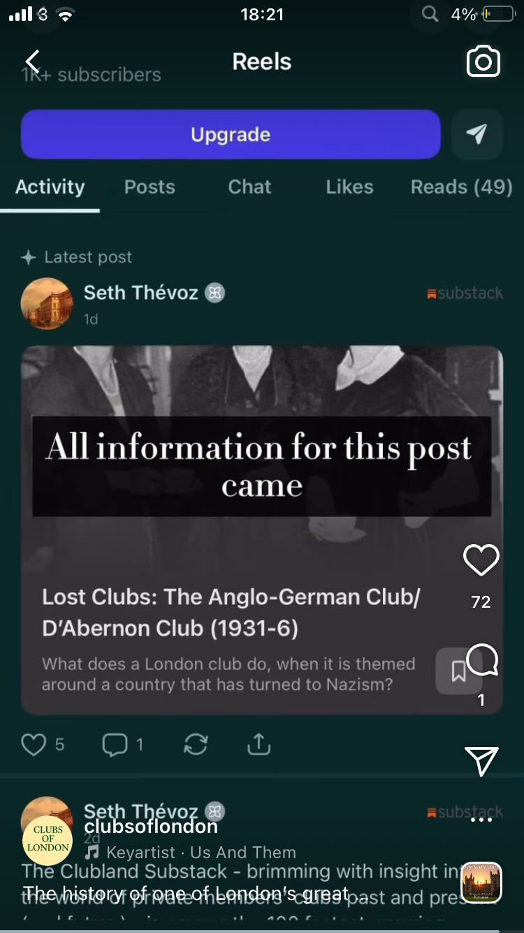 The Clubland Substack gets a plug from the @clubsoflondon Instagram feed.