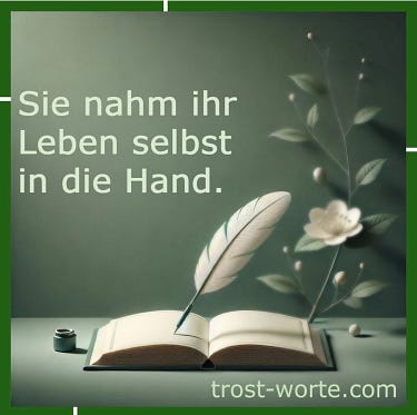 Vor einiger Zeit meldete sie sich bei mir. Weil sie vorsorgen wollte. Ihre Tochter lebt mit ihrer Familie weit entfernt, und sie wollte ihr eines Tages nichts hinterlassen, was schwer zu tragen wäre. Zu dieser Ordnung gehörte auch eine Trauerredenvorsorge. Also haben wir uns wiedergesehen. Und diesmal habe ich ihre Geschichte vollständig gehört. Und aufschreiben dürfen.