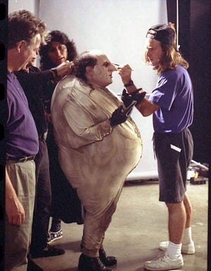 From the making of BATMAN RETURNS (1992): Danny DeVito gets his Penguin make-up touched up. Tim Burton putting him in this filthy onesie pajamas always seemed inspired to me; it’s such a stark contrast to Michelle Pfeiffer’s shiny clean vinyl.