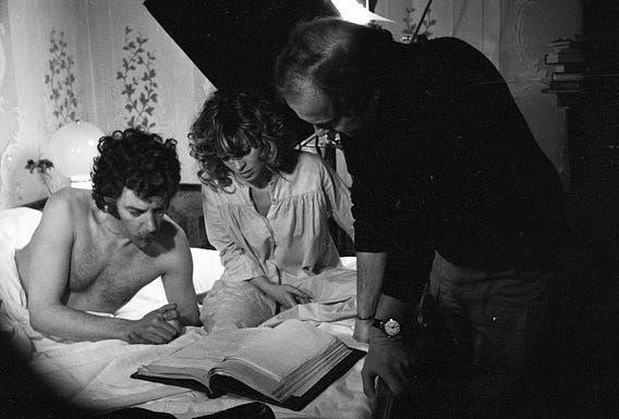 From the making of DON’T LOOK NOW (1973): Donald Sutherland, Julie Christie, and Nicolas Roeg prepare for the scene in which they are told their son has had an accident back in England.
