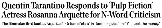 Actress Rosanna Arquette recently criticized Quentin Tarantino (who directed her in PULP FICTION) for his habitual use of the N word as “racist and creepy”. Tarantino, for some reason I cannot fathom, took the time to pen an open letter to her that he never took the time to do on all the occasions Spike Lee said the same thing about him.