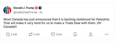 Donald Trump’s threat to punish Canada economically for recognizing Palestinian statehood is not just diplomatically reckless, it’s morally bankrupt. To suggest that Canada should turn a blind eye to the mass starvation, displacement, and killing of civilians in Gaza for the sake of securing a trade deal is as grotesque as it is transparent. The Carney government’s decision to move forward despite that pressure is an act of rare political courage, prioritizing human dignity over geopolitical convenience. No one should ever believe that Canada’s foreign policy is dictated by Washington. We are not at the beck and call of a U.S. administration that treats human lives as bargaining chips.