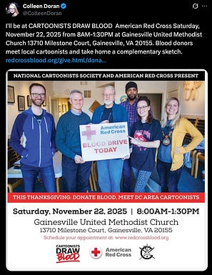 Join us for FREE sketches! Give blood and get a doodle! I’ll be there with fellow whackadoos from the National Cartoonist Society. Pencils out! Sign up for your donation appointment! This Saturday! redcrossblood.org/give.…