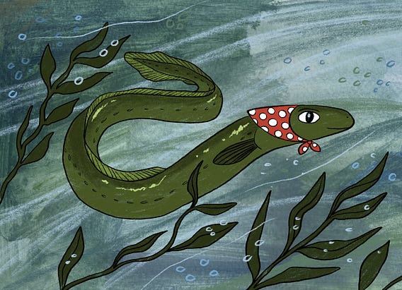 It has been a continued pleasure to explore this wonderful being into my art and stories. I am continuing my research into the Eel and her strange ways, and to the relationship between her and Heron.