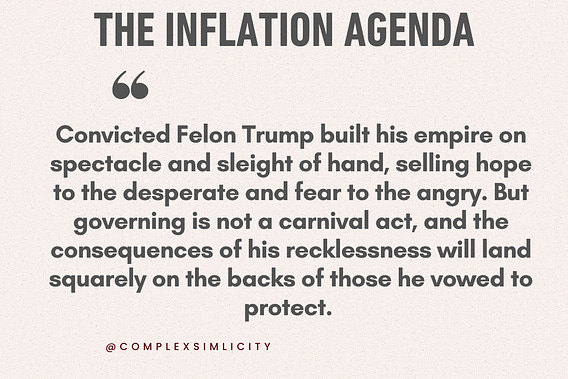 Let’s not sprinkle glitter on a pile of manure: Trump’s agenda isn’t just inflationary—it’s a blueprint for collapse. History will not forgive this glittering fraud, and neither will the generations left to pick up the pieces. The reckoning is coming, and no amount of denial will stop it.