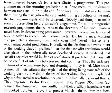 Imre Lakatos contrasts Einstein’s predictions with those advanced by Marx:
