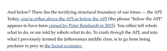 The phrase was accurate for the late SaaS era where there was a clear pair of architectural boundaries separating architects from orchestration technology and orchestration technology from individual workers. The “API” was merely an overloaded metaphor for all the limited-flexibility orchestration intelligence in the world (eg Uber dispatching) between those 2 boundaries. Above/below made sense since there was a clear power gradient. It was floor-limited by embodiment constraints, and ceiling-limited by architectural creativity/imagination constraints. Both boundaries have been blown away now. AIs can participate in the creative architecture “above the API” (getting AI to build systems from scratch with vibe-architecting) and the embodied execution “below the API” (starting with Claude rewriting your filesystem, and then controlling your physical stuff as much as you let it, to the limit of current real-world sensorium signals). So the interaction of humans and machines is shifting and all three zones are bleeding into each other.