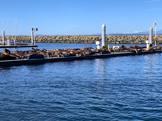 As big a herd of sea lions as I’ve seen in San Francisco, on a pier in Ballard marina
