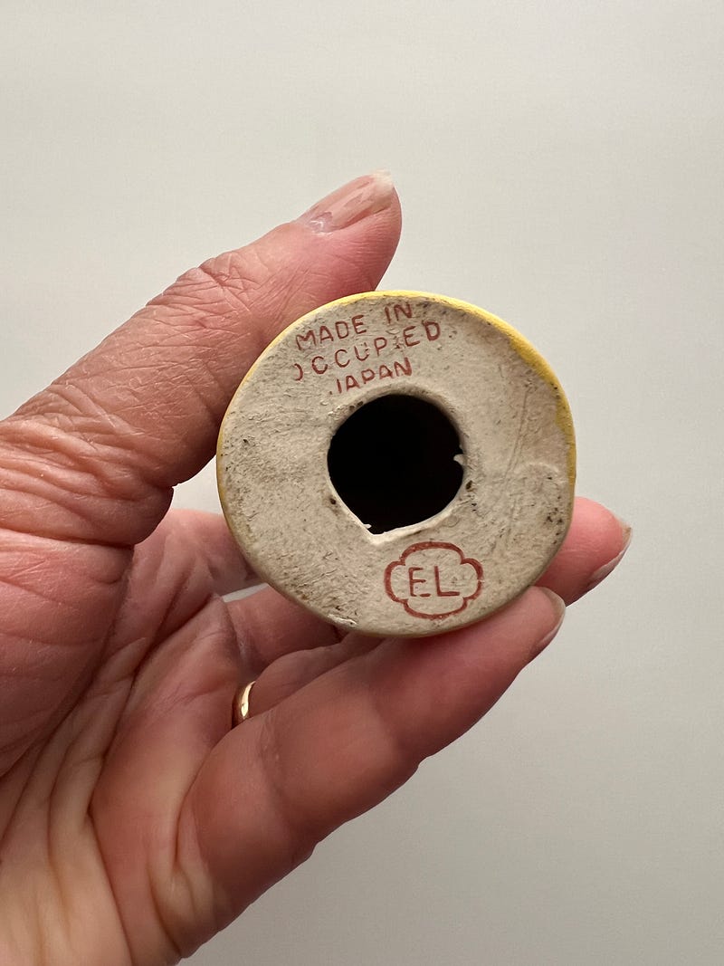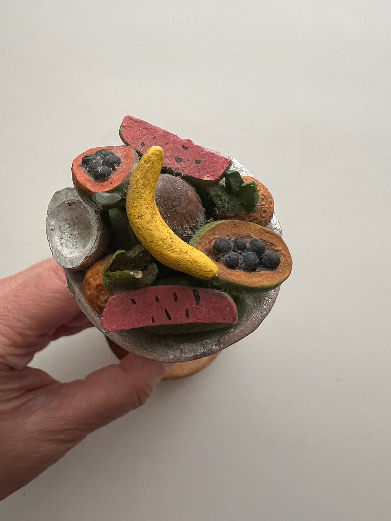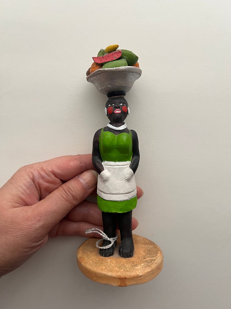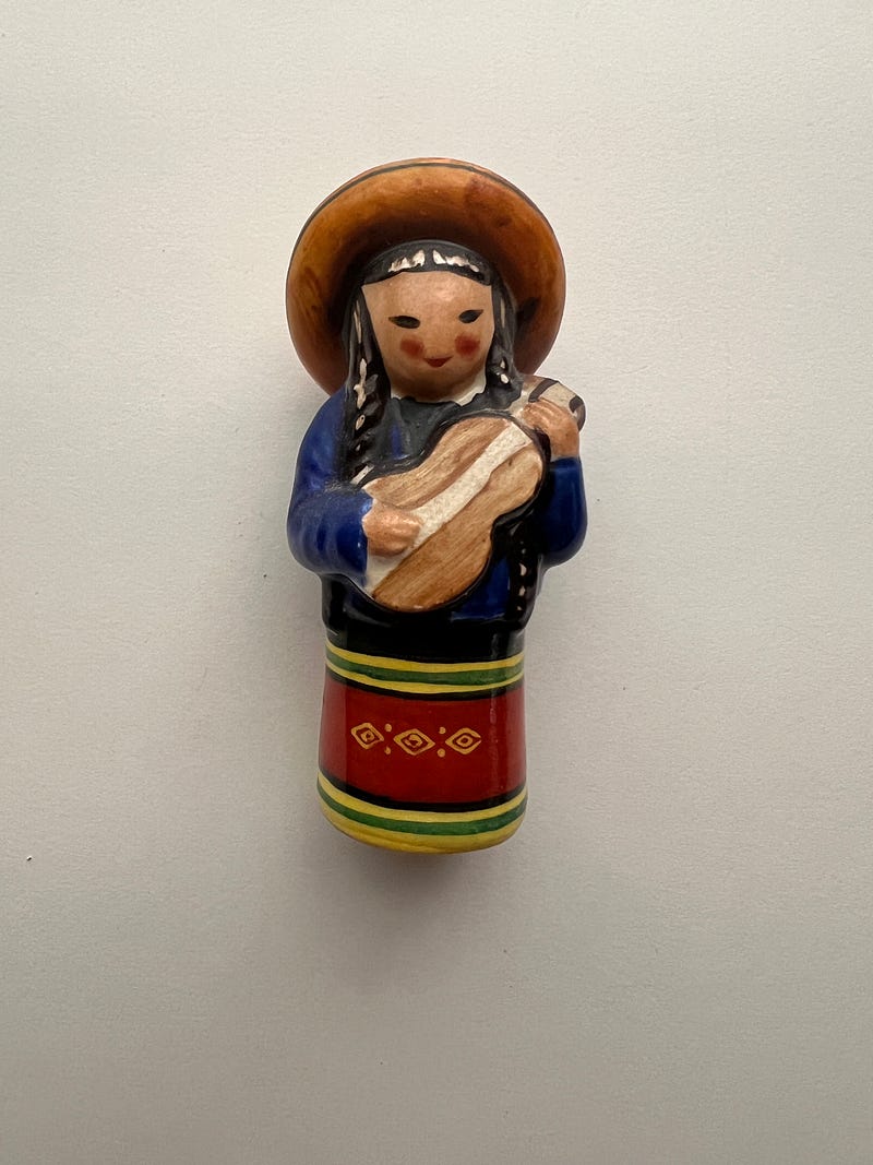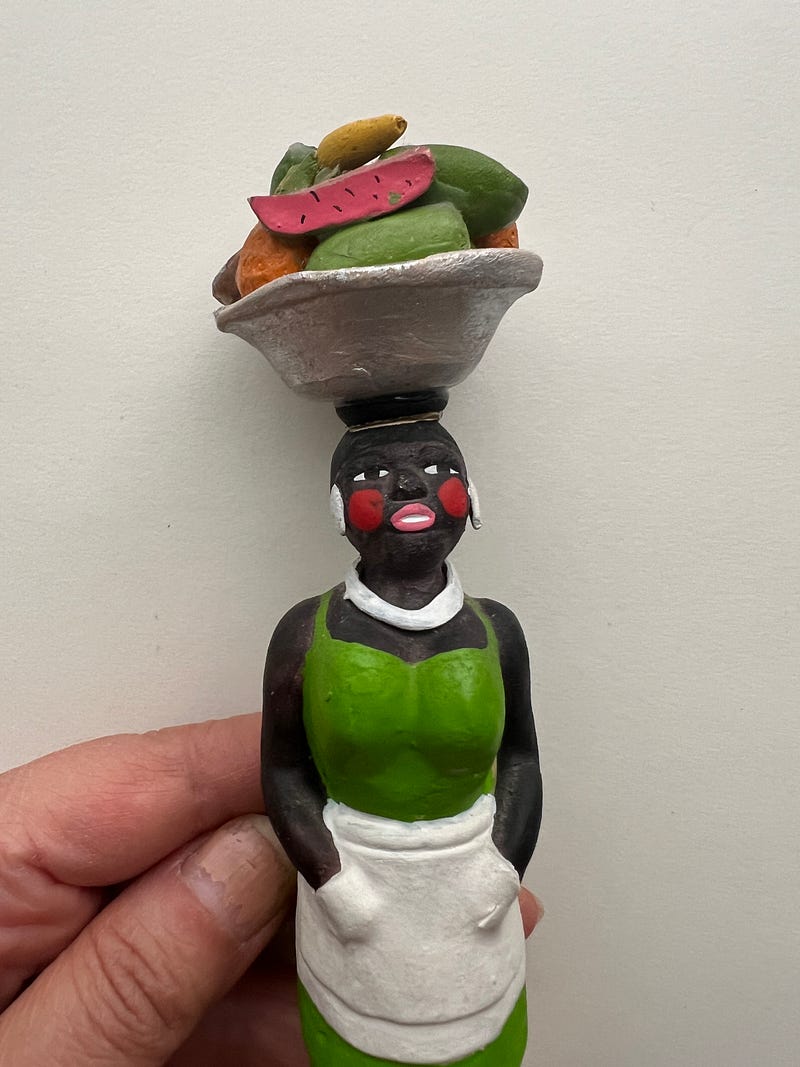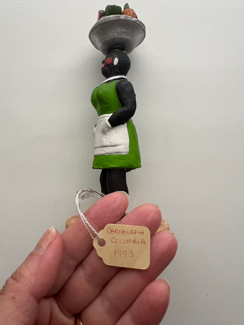 Everything you collect says something about you too! I don’t know what though 😄. I love collecting slightly off beat girl figurines/dolls. This first one has a stamp saying ‘made in occupied Japan’ which intrigued me. And the second one is from Cartagena, Columbia and I love her attitude, hands in pocket, head held proud and a basket of delicious fruits! Both were $1.99 each at my local Goodwill!