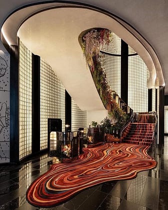 The impressive lobby staircase of the W New York – Union Square hotel reimagined.