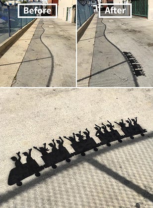 A creative street art installation by the artist Tom Bob, specifically a piece titled "Roller Coaster".